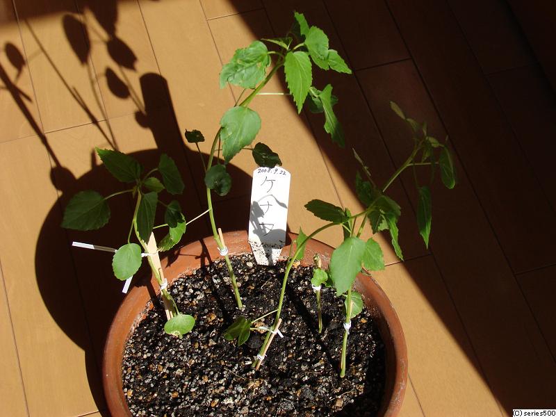 我が家におけるケナフの発祥は、とある保険会社から粗品として貰ったケナフの種を、蒔きどき4~8月/花どき9~11月/発芽適温20℃と言われているにも関わらず、2008年9月22日に10粒ほどの種を再生紙で出来た鉢に蒔いたことに始まります。[参照:第662項]