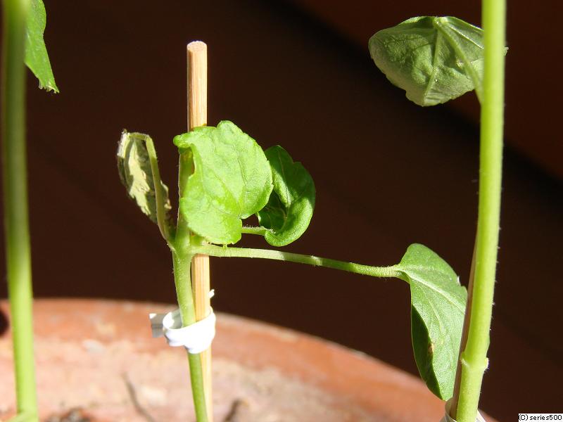 それで、双葉から上をバッサリ切り落として、添木をしていた結果、切断した箇所ではなく、双葉の根元と切断した部分の間から、新しい葉っぱが最近になって出てきたのです。