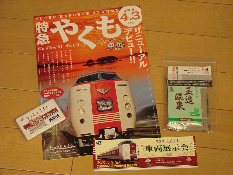 展示車内に入る際に粗品が貰えましたが、中身はパンフレット・玉造温泉の素・ゆったりやくもMINTIAなどと、かなり宣伝に力を入れている印象を受けました。