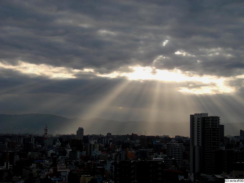 朝、雲の隙間から光が射しこんで大変に綺麗な光景を拝めました。