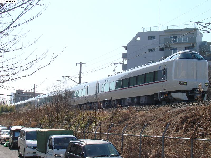 で、いつもの場所に撮りに行ったのですが、今回は線路を跨いだ反対側から撮影しようと考えていて、その場所を目指していたんですけど、のんびり歩き過ぎたようで、線路沿いを歩いていて振り返ると、287系がほんの100mほど後ろに迫っていました。